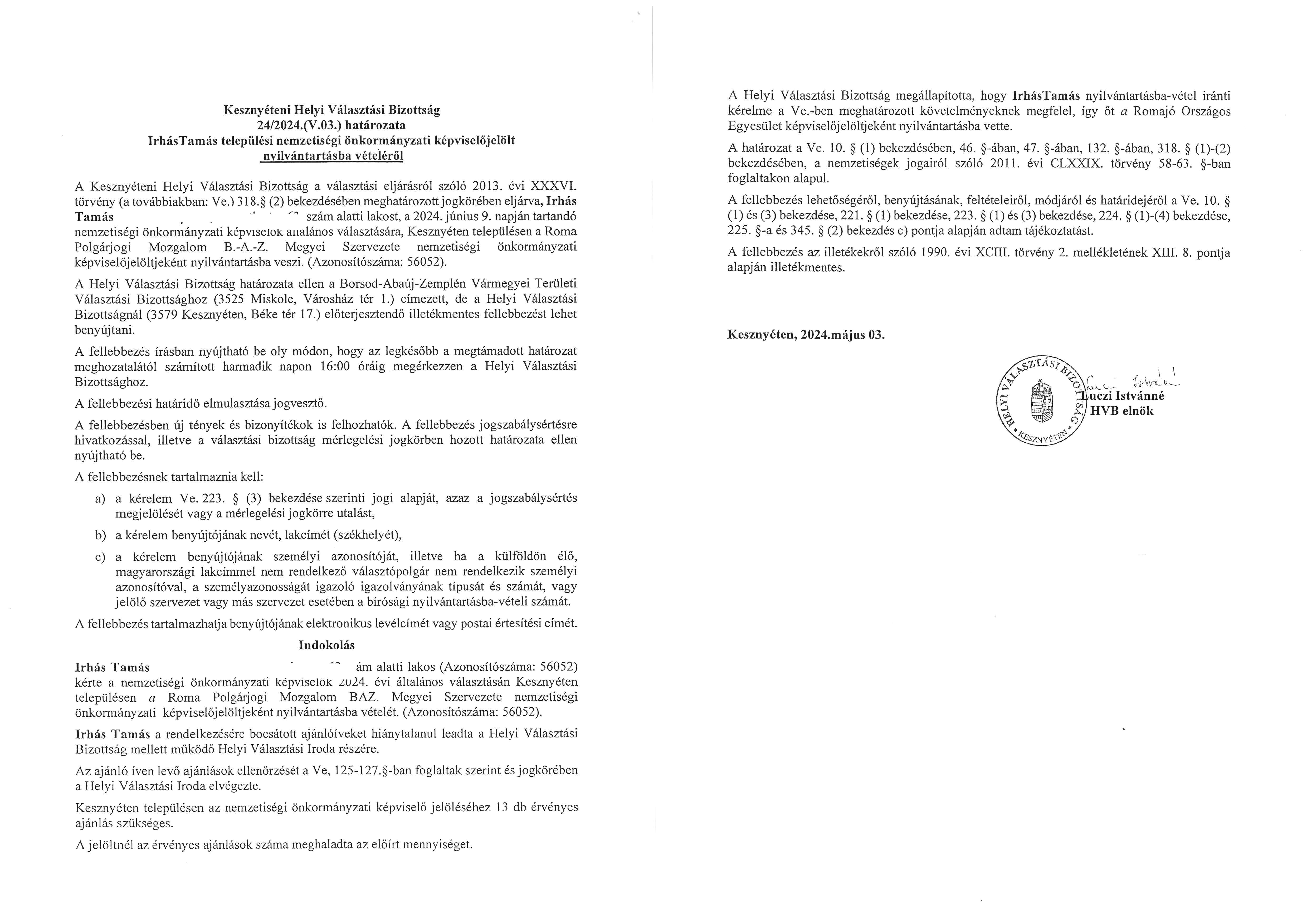 Nemzetiségi képviselő-jelölt nyilvántartásba vétele.